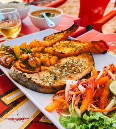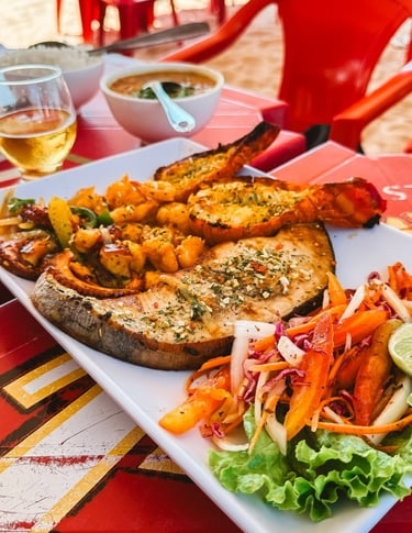 Onde comer: Almoçamos no Restaurante do Anselmo, pé na areia. Pedimos um "Mistão de Frutos do Mar" (lagosta, camarão, polvo e peixe) por R$ 200 que serve duas pessoas muito bem.