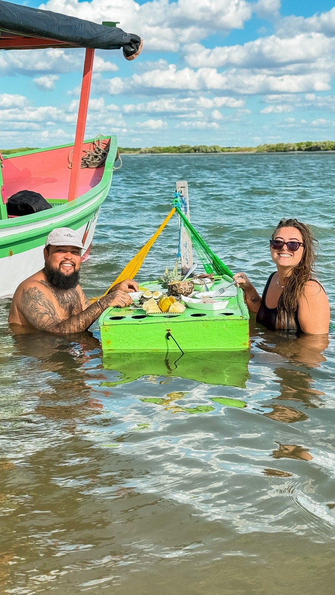 O Raimundo preparou um almoço delicioso incluindo ostras frescas colhidas por ele no berçário e um ceviche delicioso feito no abacaxi. Ousamos dizer que foi um dos ceviches mais gostosos que já experimentamos. E tudo isso com direito a rede dentro da água e tudo.