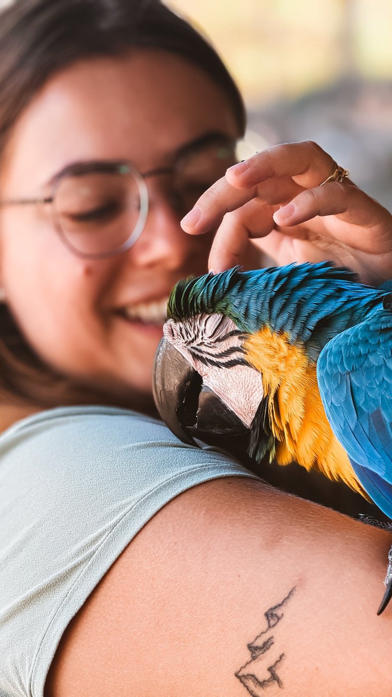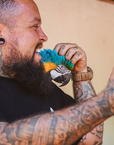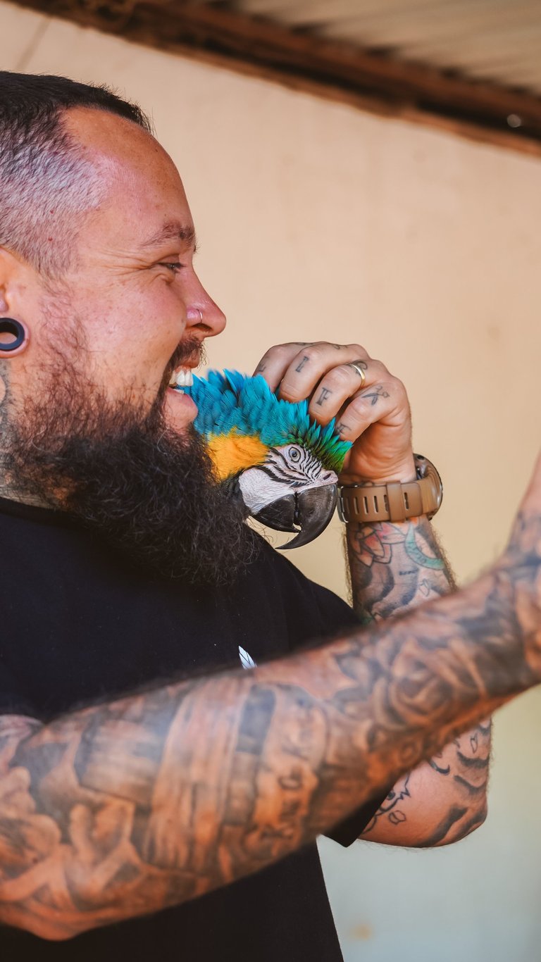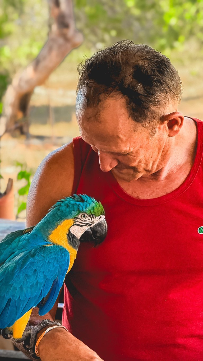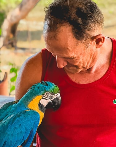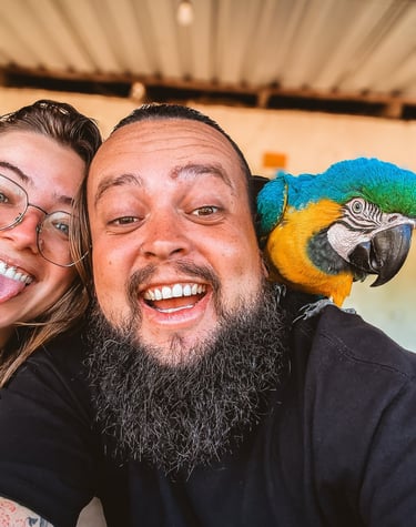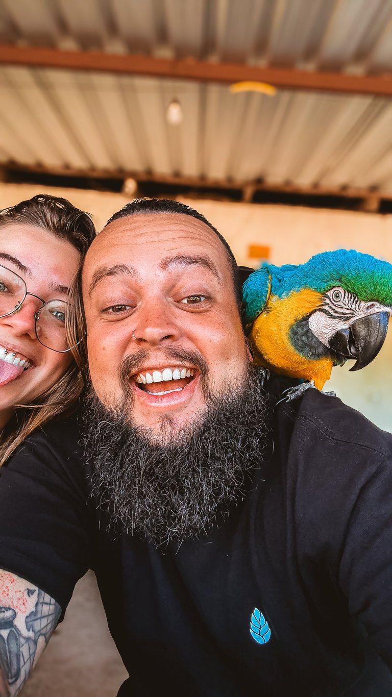 Tivemos o privilégio de ver araras de pertinho! São animais selvagens e totalmente livres, mas que escolheram a casa do dono da cachoeira como lar. Elas saem para voar pela região, mas sempre voltam para lá. A conexão foi tanta que chegamos a pegar uma delas – uma experiência emocionante que só quem vive a estrada consegue sentir.